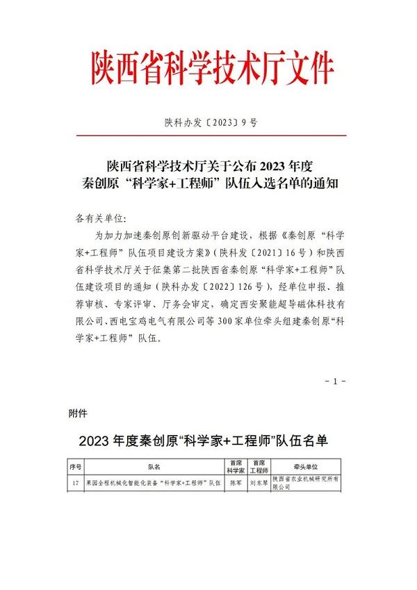 近日,陜西省科技廳公布了2023年度秦創(chuàng)原“科學家+工程師”隊伍入選名單,陜西農(nóng)業(yè)機械研究所有限公司工程師團隊聯(lián)合西北農(nóng)林科技大學陳軍教授團隊共同申報的“果園全程機械化智能化裝備‘科學家+工程師’隊伍”成功入選。