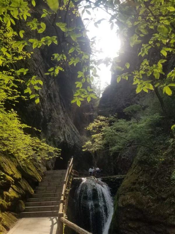 春日里的牛背梁,青山蒼翠,飛瀑直瀉而下。羚牛谷的木棧道旁,一棵棵樹木橫亙?cè)跅5乐虚g,生動(dòng)體現(xiàn)了“人與自然和諧共生”。