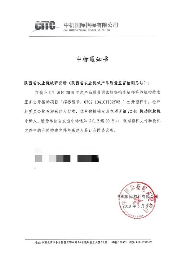 據(jù)中國政府采購網(wǎng)消息,中機國際招標有限公司受國家市場監(jiān)督管理總局科技和財務(wù)司委托,根據(jù)《中華人民共和國政府采購法》等有關(guān)規(guī)定,對2019年度產(chǎn)品質(zhì)量國家監(jiān)督抽查抽樣檢驗機構(gòu)技術(shù)服務(wù)公開招標項目進行公開招標。6月5日,中國政府采購網(wǎng)發(fā)布國家市場監(jiān)督管理總局科技和財務(wù)司2019年度產(chǎn)品質(zhì)量國家監(jiān)督抽查抽樣檢驗機構(gòu)技術(shù)服務(wù)公開招標項目中標公告,陜西省農(nóng)業(yè)機械研究所(陜西省農(nóng)業(yè)機械產(chǎn)品質(zhì)量監(jiān)督檢測總站)一舉中標,成為國家監(jiān)督抽查機動脫粒機產(chǎn)品承檢機構(gòu),并是三家單位中的牽頭單位。這是我所(站)首次參加國抽投標并中標承擔國家級監(jiān)督抽查任務(wù)。