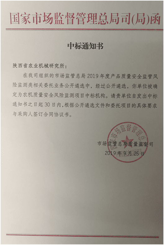 通過(guò)國(guó)家市場(chǎng)監(jiān)管總局質(zhì)量監(jiān)督司2019年度產(chǎn)品質(zhì)量安全監(jiān)管風(fēng)險(xiǎn)監(jiān)測(cè)類相關(guān)委托業(yè)務(wù)公開(kāi)遴選,陜西省農(nóng)業(yè)機(jī)械研究所(陜西省農(nóng)業(yè)機(jī)械產(chǎn)品質(zhì)量監(jiān)督檢測(cè)總站)成功中標(biāo),成為全國(guó)農(nóng)機(jī)產(chǎn)品質(zhì)量安全風(fēng)險(xiǎn)監(jiān)測(cè)項(xiàng)目承檢機(jī)構(gòu)。這是我所繼成功中標(biāo)國(guó)家級(jí)產(chǎn)品質(zhì)量監(jiān)督抽查任務(wù)之后的又一重大喜訊!
