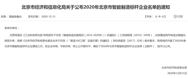 2020年12月31日,北京市經濟和信息化局發布了2020年北京市智能制造標桿企業名單,北大維信為入選的海淀區兩家企業之一,此次入選北京市智能制造標桿企業名單的企業共21家。