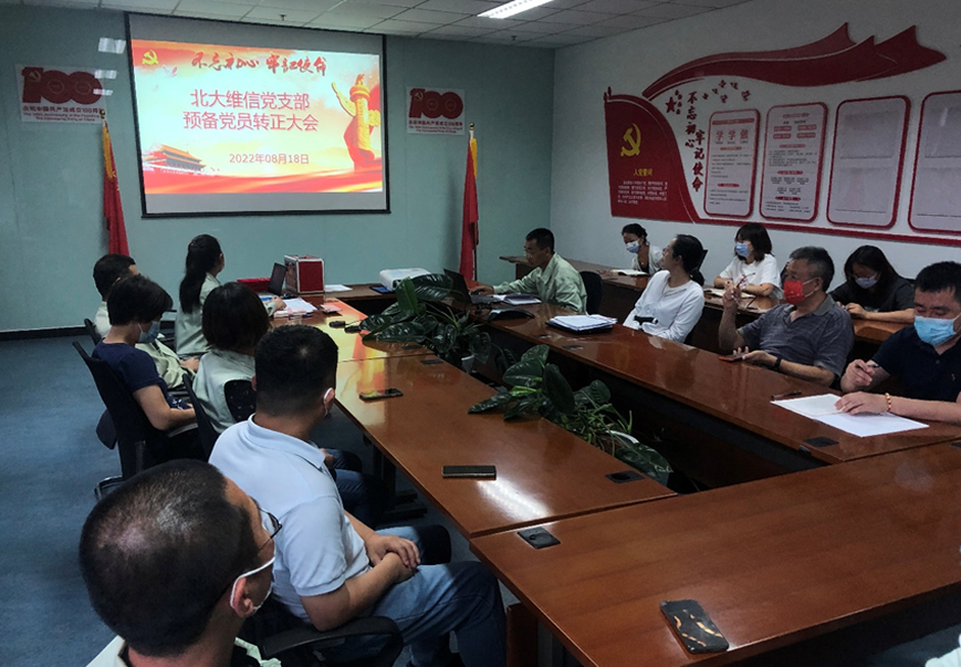 8月18日下午,北大維信黨支部在黨群活動(dòng)室舉行北京市第十三次黨代會(huì)精神宣講報(bào)告會(huì)暨預(yù)備黨員轉(zhuǎn)正大會(huì)。大會(huì)由黨支部書記劉煒主持,支部黨員、預(yù)備黨員及部分團(tuán)干部參加了會(huì)議。