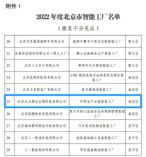 2022年11月25日,北京市經濟和信息化局公布了2022年度北京市智能工廠和數字化車間名單。北大維信通過了2022年度北京市智能標桿企業復核,入選2022年度北京市智能工廠。